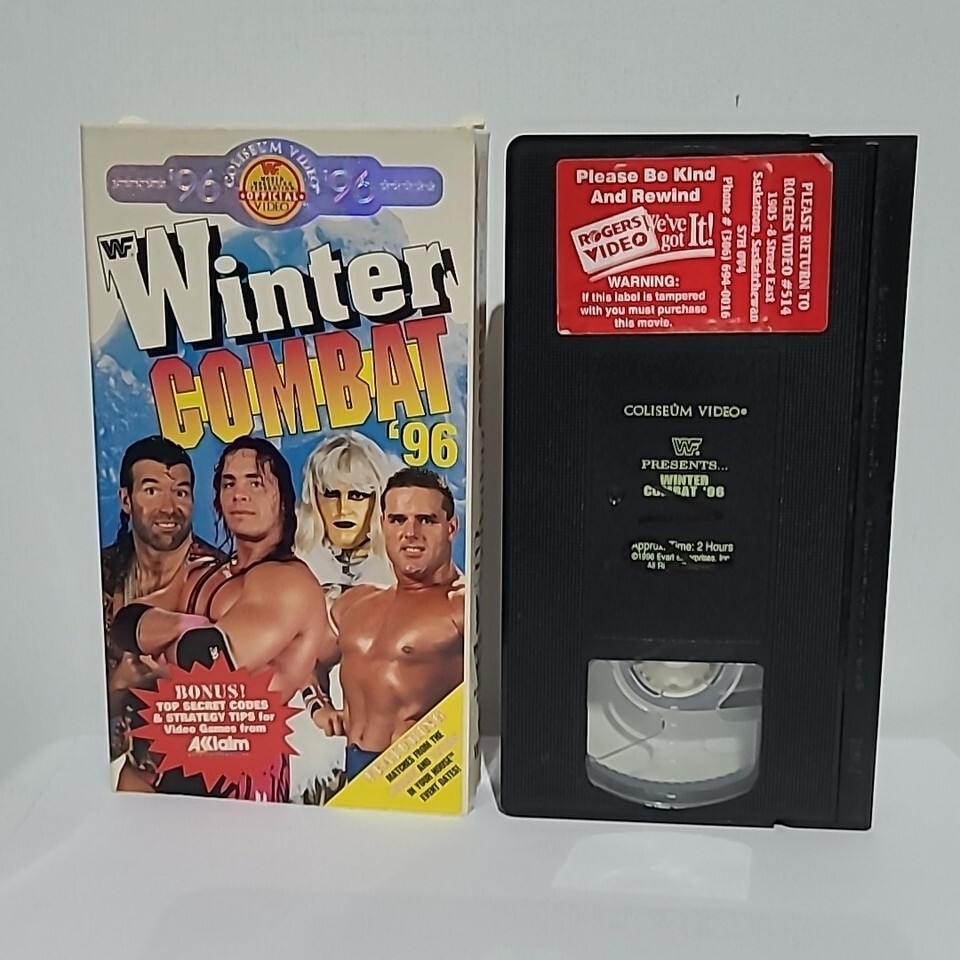 WWF Winter Combat '96 wrestling VHS tape. Good shape and plays like it should. No mold, and is an EX-RENTAL from a video store called Rogers Video.