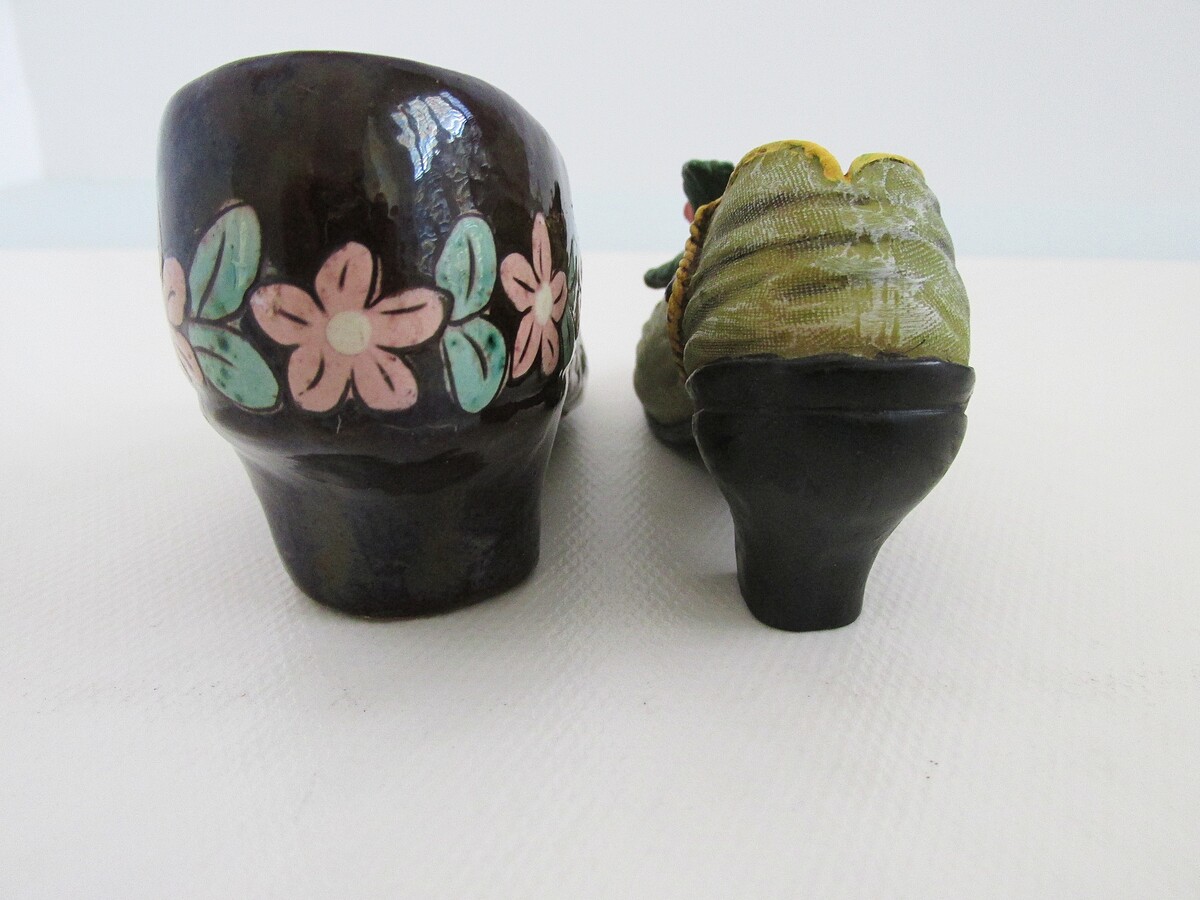 Description: Up for sale is a lot of (2) vintage collectible hand painted ceramic antique Victorian shoes. These hand painted figurines have multicolored floral designs. The larger shoe has a pink blue floral pattern on a chocolate brown base. The smaller shoe has a raised rose in pink green onan olive green base.The overall height are 1.75"/2.25, the width (at the widest point) 1.00"/1.25, and the length (at the longest point) 4.00". These figurines are in perfect condition. They haven't any cracks, or chips and never have needed repair.