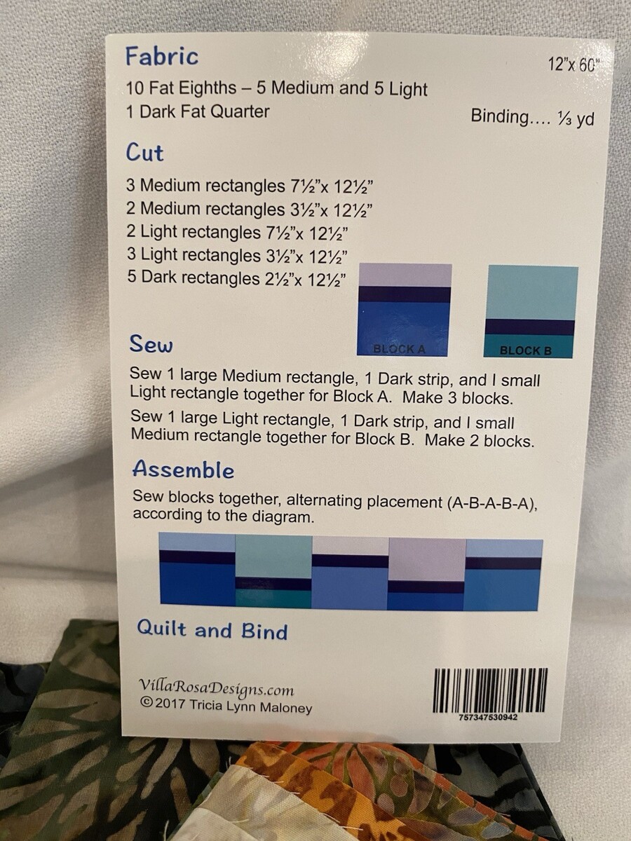 New! Villa Rosa Designs Ripple Runner Quilting Kit Multicolored Includes: Pattern (10) 9" x 15" Batik Fabric Cuts 1/3 Yard Dark Batik Fabric 1 Fat Quarter Dark Batik Fabric Finished Size - 12" x 60" 100% Cotton NEW See all photos. Check out my other items! I am happy to combine shipping and only charge actual shipping charges - NO HANDLING FEES! My goal is always 100% complete customer satisfaction. If you feel your item has arrived "not as described", please contact me to arrange for return/refund before leaving feedback I am a trading assistant. I can sell your items for you! |KES-NR|