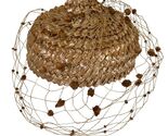 Charming vintage Debbie woven raffia hat in warm honey brown with a playful pom-pom veil. The layered, glossy raffia creates a sculptural pillbox shape that flatters from every angle. Gold lace interior with a soft brown velvet band for comfort and structure.