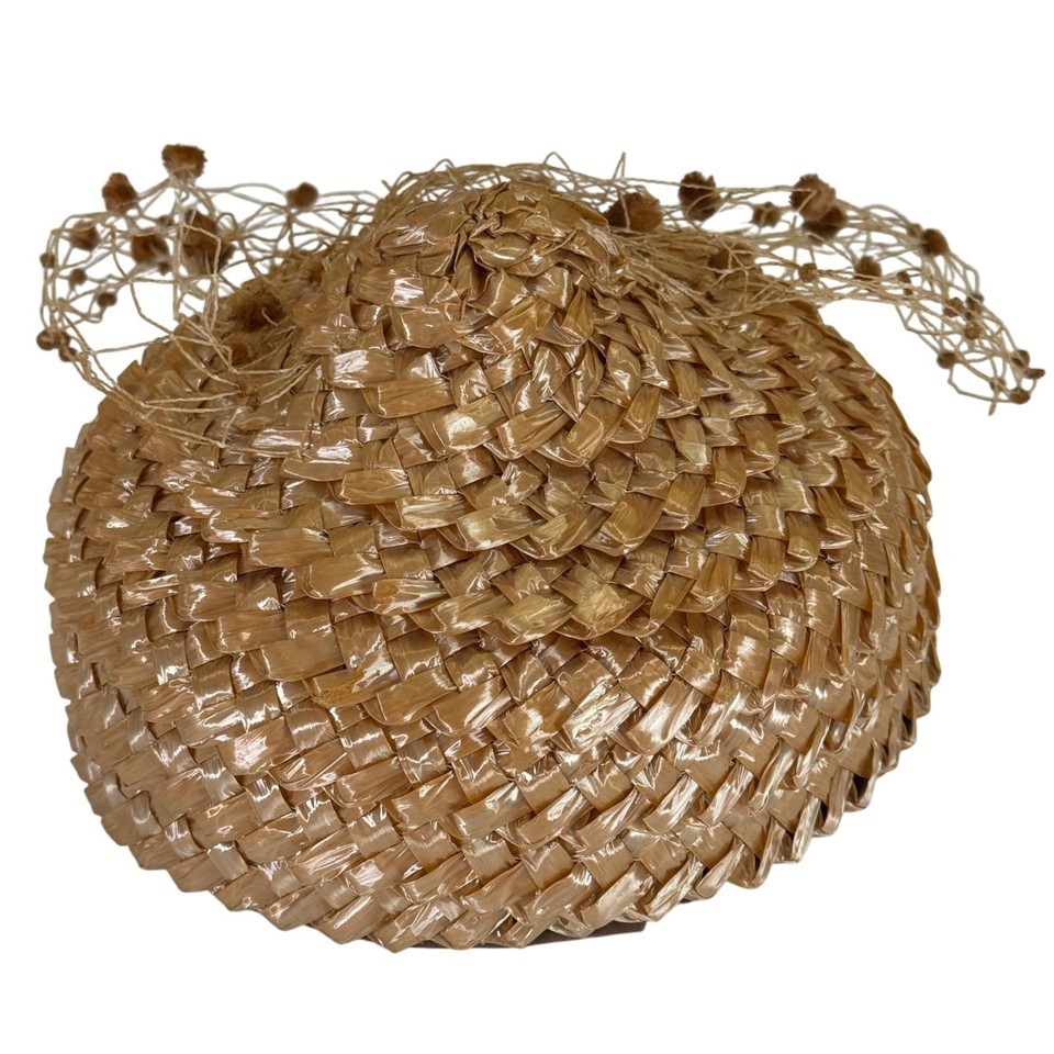 - Vintage 1950s Debbie Raffia Hat with Pom-Pom Veil Net Honey Brown Pillbox Style