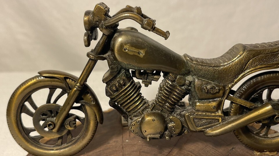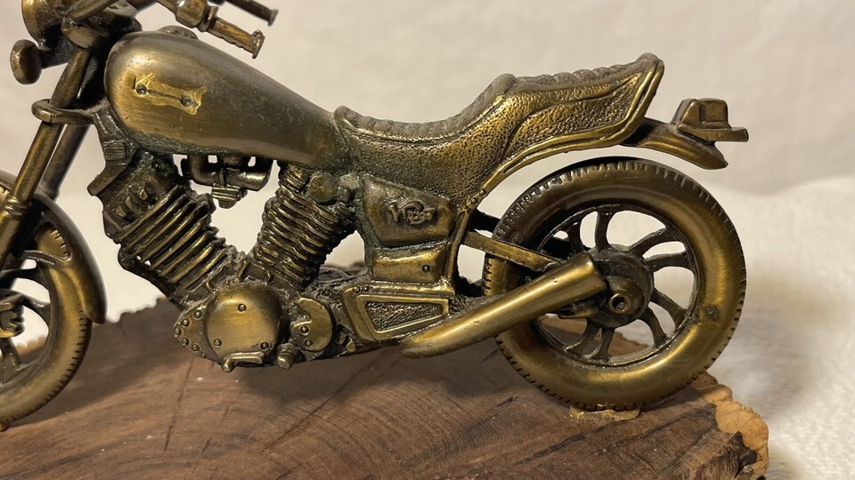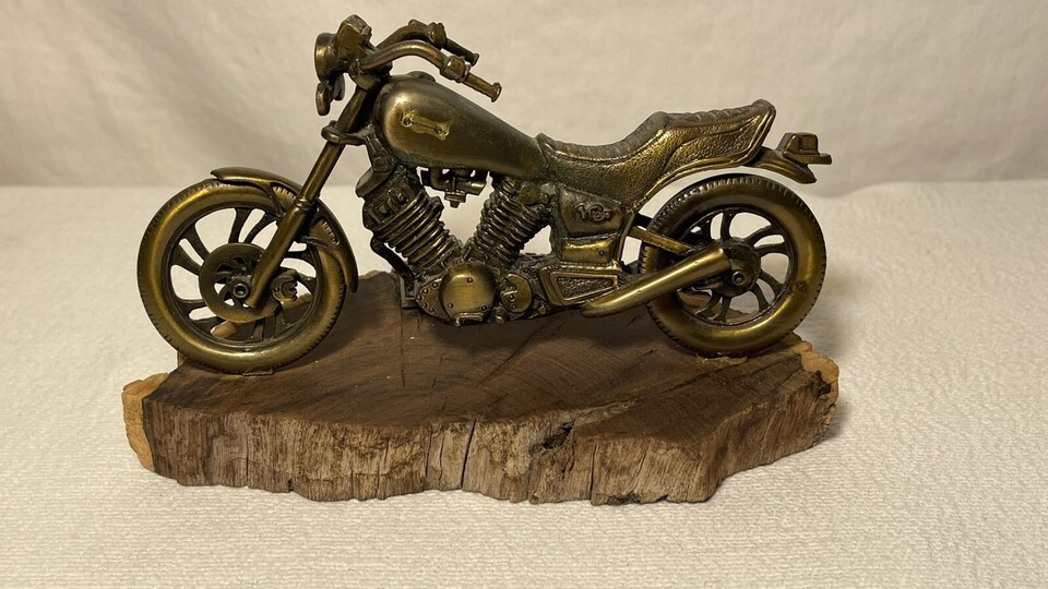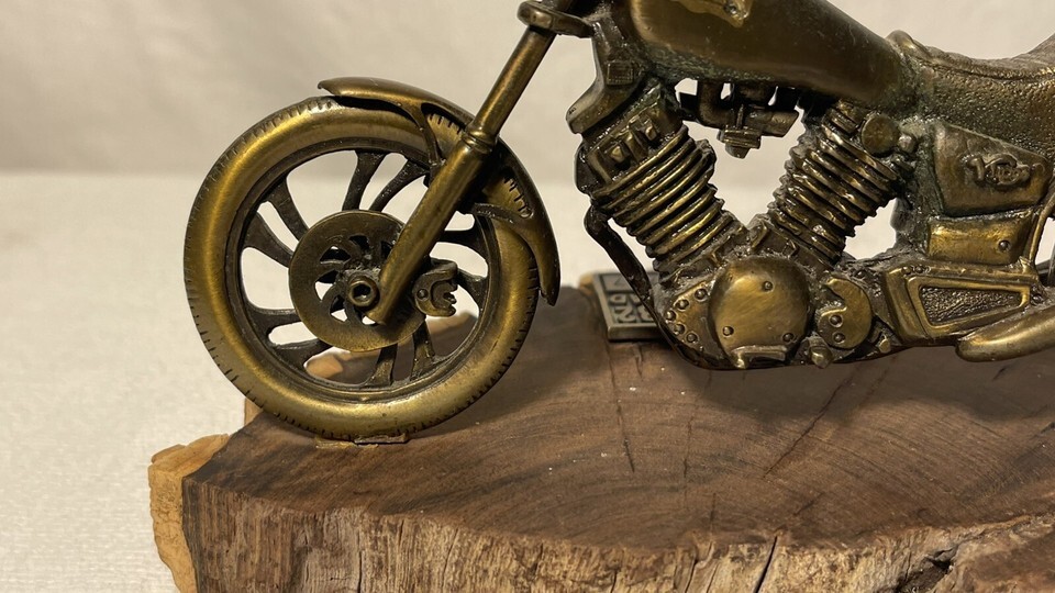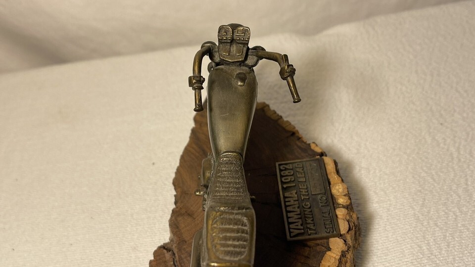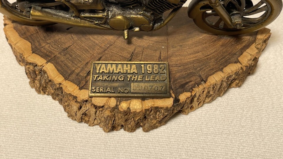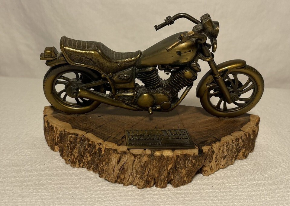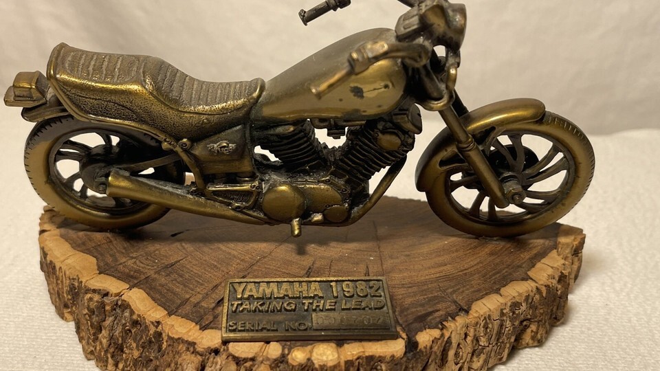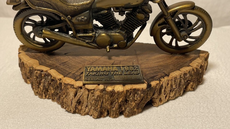 The product is a vintage 1982 Yamaha Virago "Taking The Lead" replica dealer desk statue promo. This collectible item was made in the United States and is related to motorcycles and motorcycle memorabilia. It likely features a design inspired by the Yamaha Virago model from 1982 and was used as a promotional item for dealers.