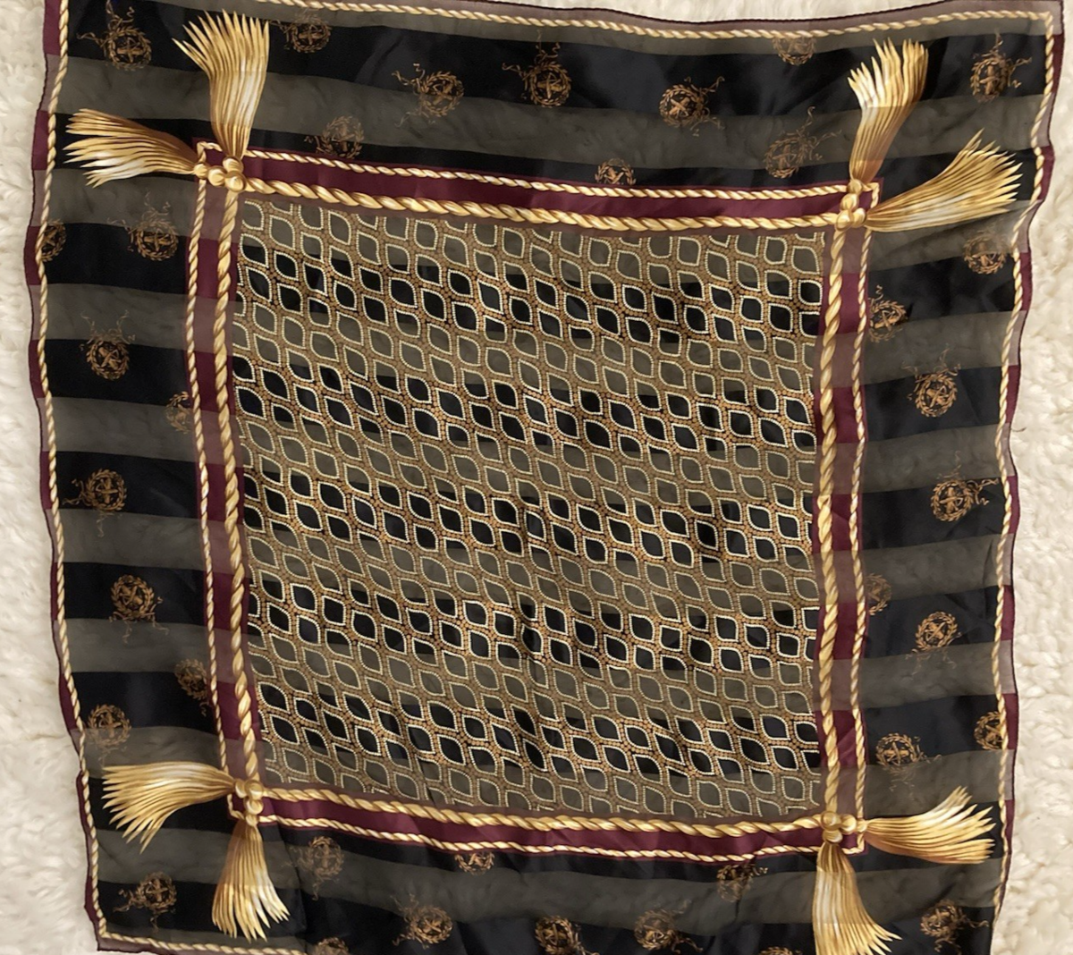 - Vintage Anne Klein Tassels Rope Medallions Silk Scarf Japan BIG 35 Inch Square