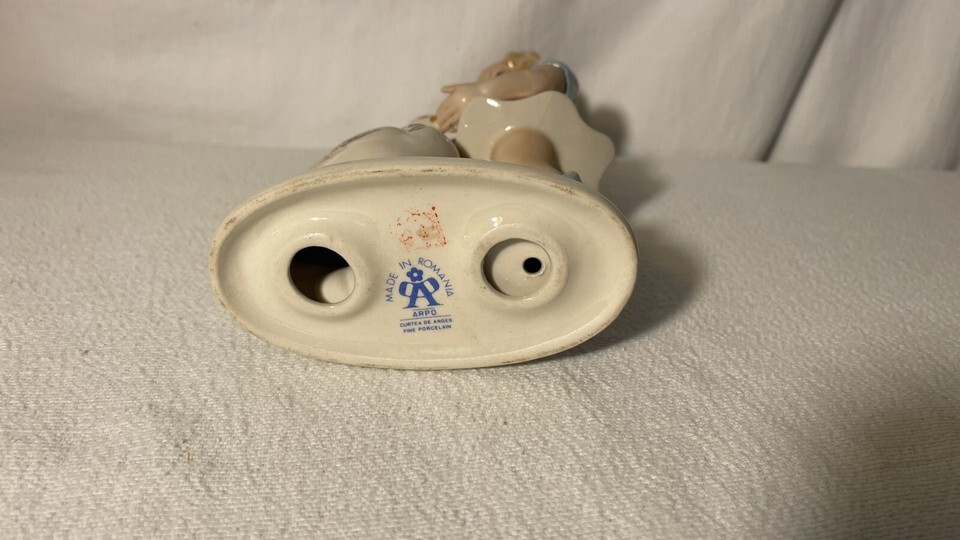 This vintage antique figurine made by ARPO in Romania depicts a girl feeding a duck goose. The multicolor ceramic and porcelain material with an antique finish adds to its charm. The figurine is perfect for collectors and is listed under the categories of Collectibles, Decorative Collectibles, and Sculptures Figurines. The brand ARPO is known for its intricate designs and this figurine is no exception. It would make a great addition to any collection and is a unique piece that will catch the eye of any visitor.