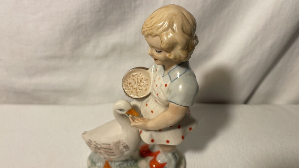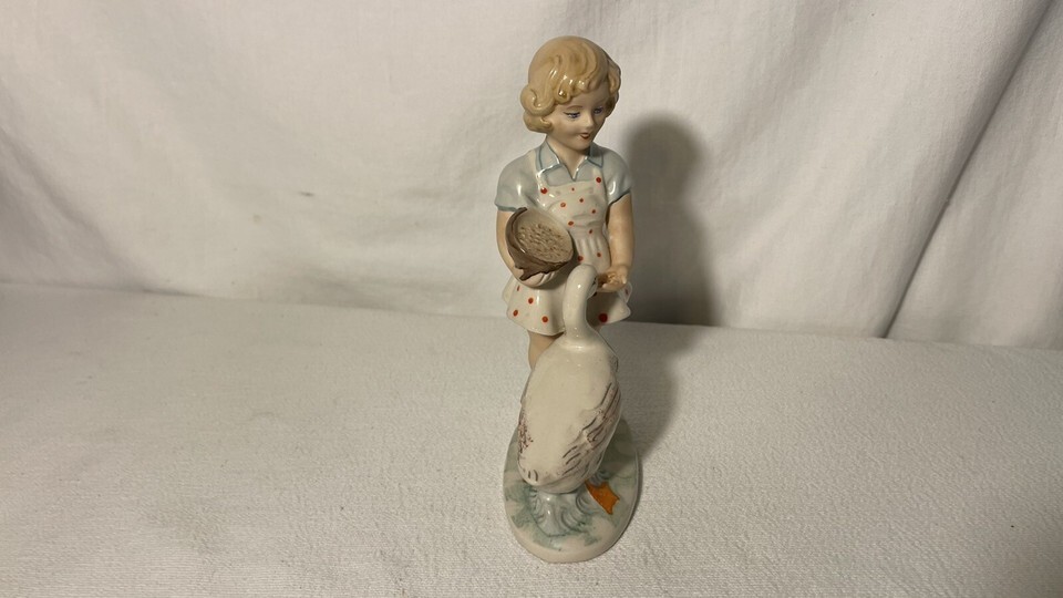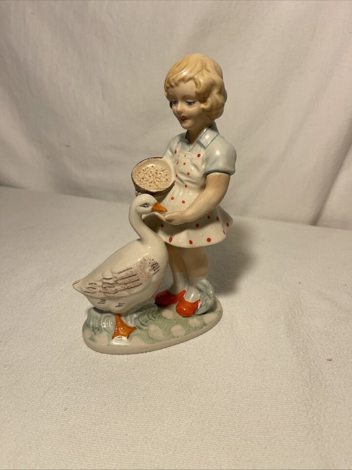 Vintage Antique ARPO Made in Romania Girl Feeding Duck Goose Figurine