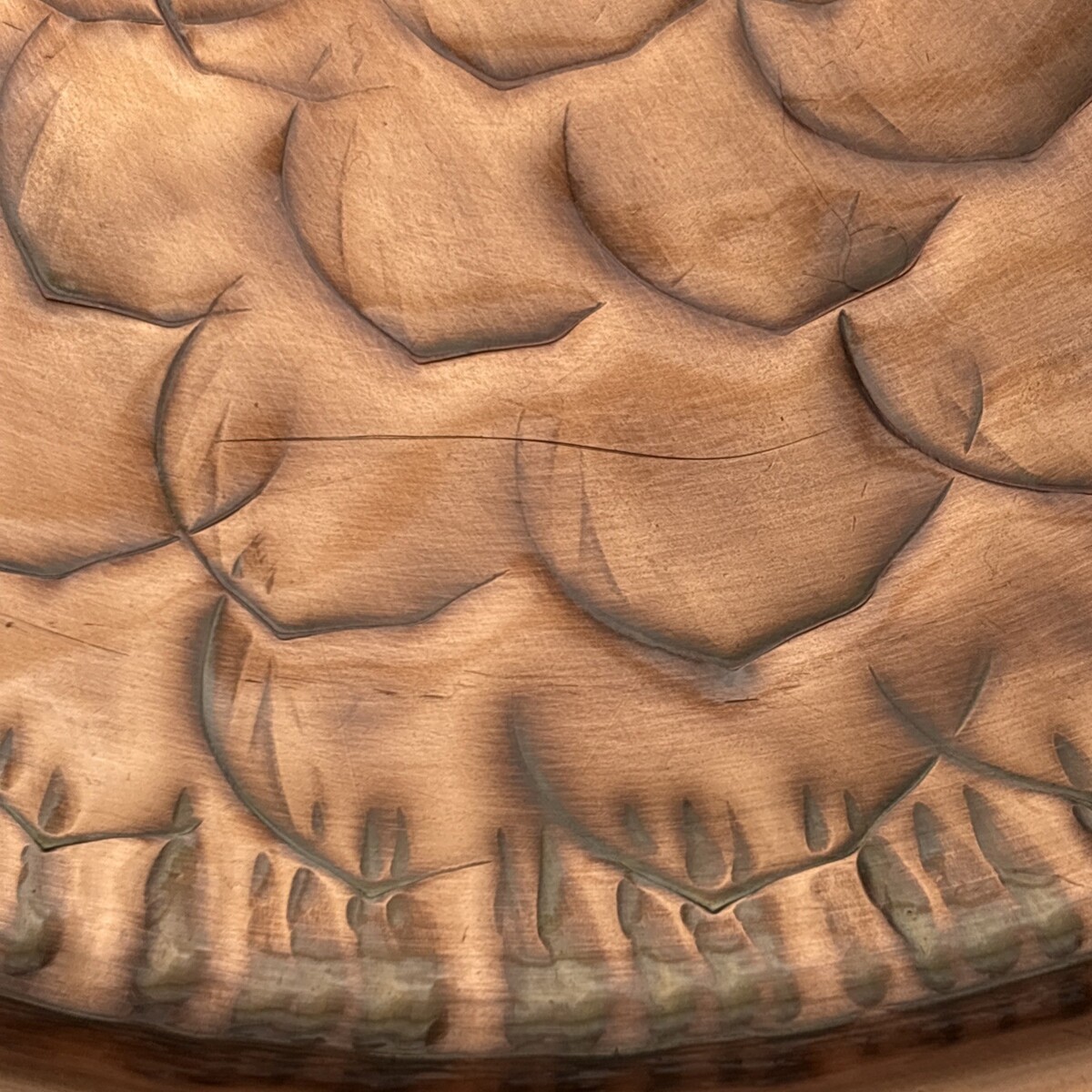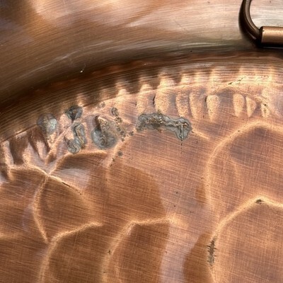 Vintage Hammered Copper Flower Tray Centerpiece Large 14" x 0.75" D Weighs in at 1 pound 10 oz Gregorian Handcrafted Hammered Copperware Made in USA Signed and marked #905 Ring to mount on a wall Peony flower design...I have 2, made in different eras and this one has rounder "petals" Some wear from storage, display and use. Lays fairly flat. No severe bends or dents.