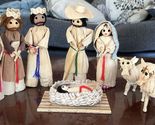 The Vintage Handmade Folk Art Corn Husk Nativity Scene is a unique and charming addition to any Christmas celebration. This medium-sized set includes figures such as Joseph, the horse, the wise men, a cow, and Mary, all made from beige corn husks. The traditional Nativity scene featuring Jesus as the central subject is handmade with attention to detail, showcasing a vintage artistry. Standing at 8 inches tall, this original collection of 10 items brings a special touch to holiday decor, showcasing the beauty of folk art and the spirit of the season.