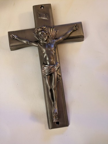 - Vintage INRI Metal Crucifix Cross Casket Coffin Wall Hanger 13 Inch Satin Nickel