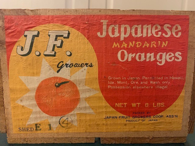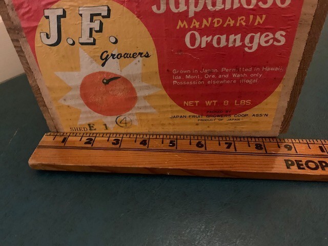 Vintage Japanese Mandarin Oranges Wooden Crate Wood Box J.F. Growers 12 x 9 x 6 Good solid used condition. Some scuffs and stains as shown. Please refer to images.