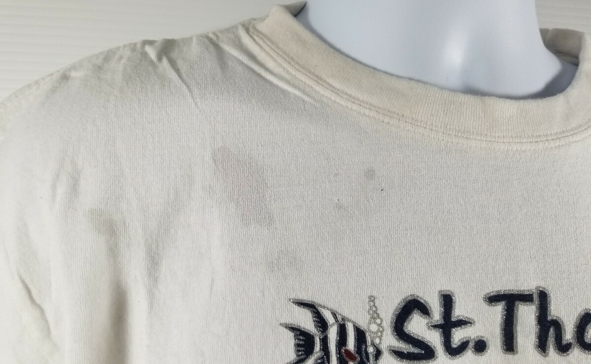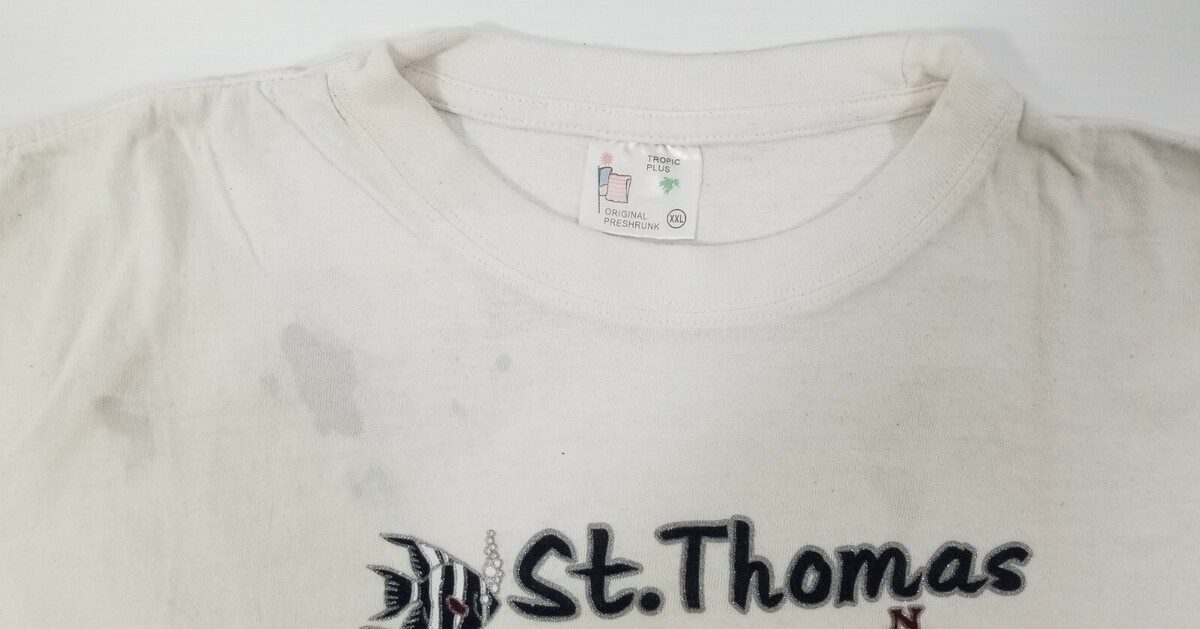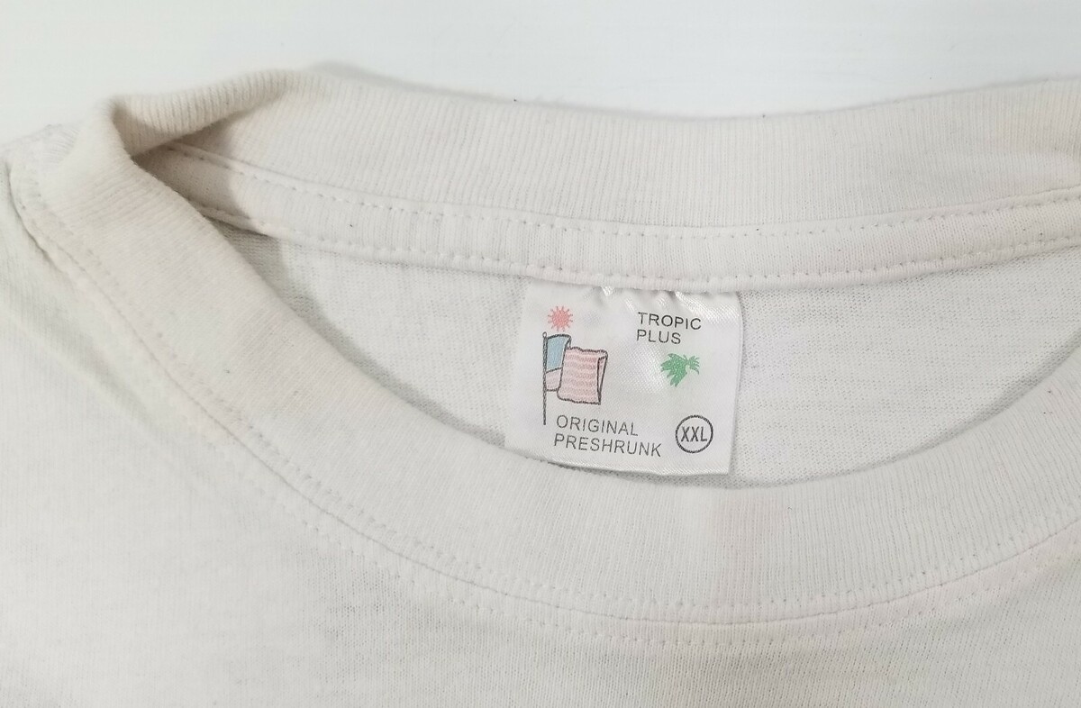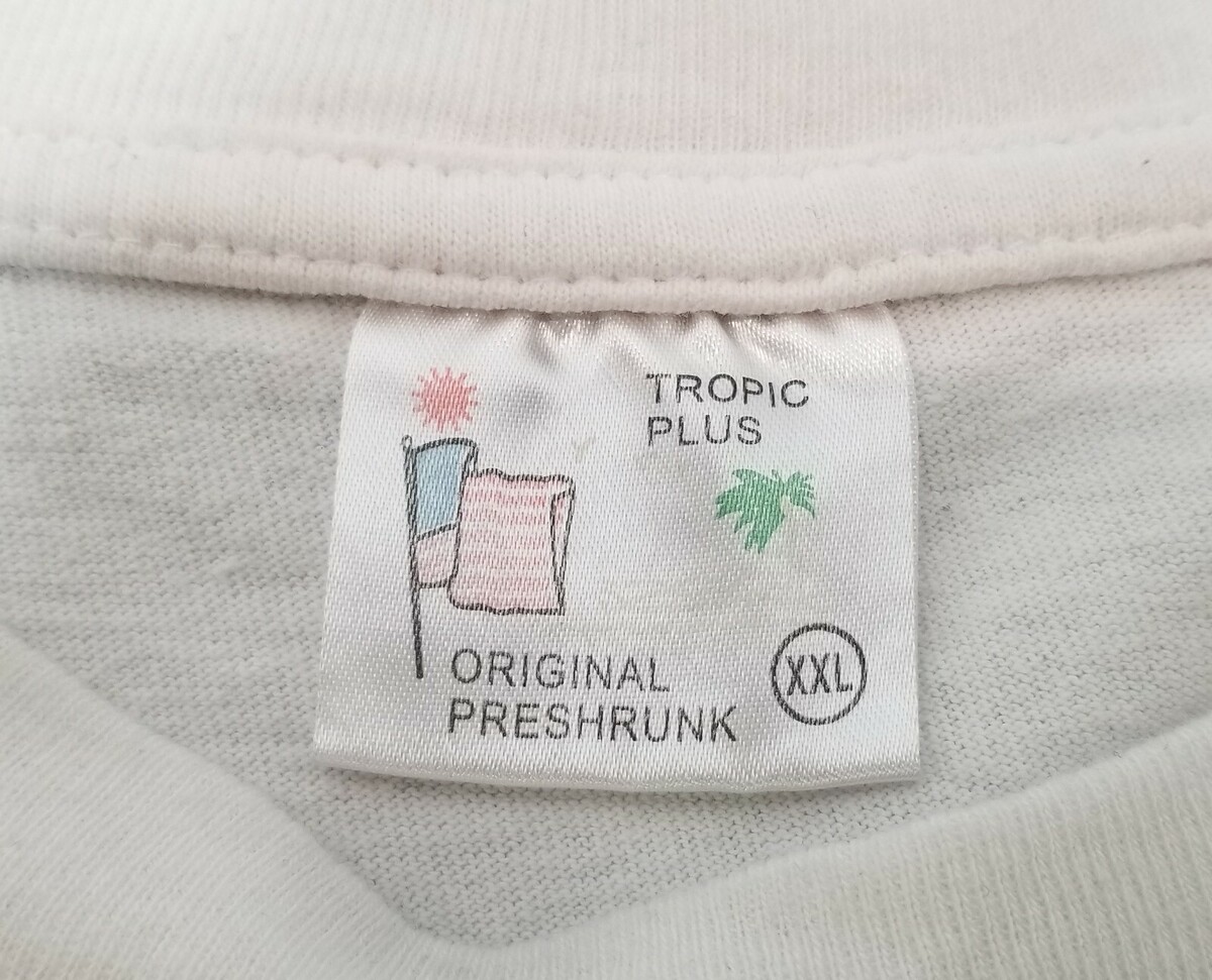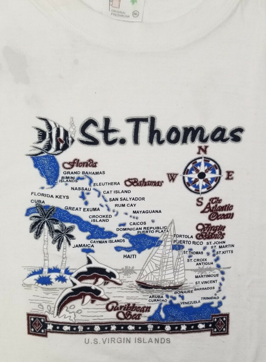 St. Thomas US Virgin Islands Vacation Souvenir White T-Shirt Tropic Plus Tagged size XXL but please see measurements as it runs small. 100% Cotton Approximate measurements: Shoulder to shoulder - 20" Shoulder to sleeve cuff - 7" Armpit to armpit - 22" Armpit to sleeve cuff - 5-1/2" Top of rear collar to bottom back - 25-1/2" Shirt is in vintage, used condition with signs of age, use and storage including some staining, fabric piling and discoloration. There is some storage staining on top right chest and rear shoulder.