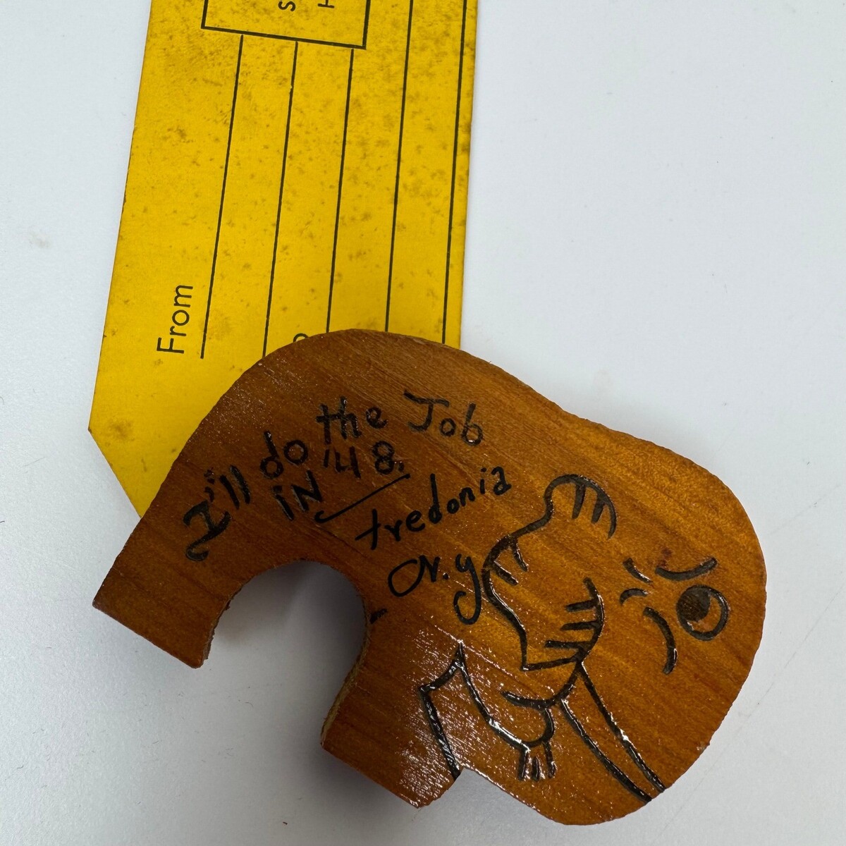 Vintage Wooden Elephant Figurine with Fredonia NY Postcard Tag Mail