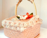 Vtg Wicker Sewing Picnic Basket Quilted Pink Satin Lace Floral Applique Korea