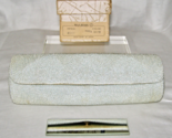VINTAGE WALBORG ICE BLUE COLOR SMALL IRRIDESCENT BEADED BARREL-SHAPED CLUTCH EVENING HANDBAG + + ORIGINAL BOX w/ LABEL + + ORIGINAL SHAPED 2-SIDED MIRROR - HANDMADE, ORIGINAL LABEL ?HAND MADE IN JAPAN? - MICRO-MINI IRRIDESCENT BEADS IN SUBTLE GRAPHIC PATTERN - TOP OPENING, TOP FLAP w/ SNAP CLOSURE - SATIN LINED - GOOD VINTAGE CONDITION MEASUREMENTS: Bag: 2 3/4 inches High x 8 inches Wide x 2 1/2 inches Deep Mirror: 1 1/8 inches High x 4 inches Wide Box: 2 1/2 inches High x 9 inches Wide x 3 1/4 inches Deep CONDITION: In Good Vintage Condition, with light staining on the lining. Please see photographs. Please note: Shipping discounts will apply on additional items. Please see my other auctions. Please note: Grading of Condition and Value: Grading is a subjective art and does vary between individuals and experts alike. We provide the best quality images that we can. Based on these images, and your own level of experience, you should assign your own grade and valuation. Terms of Sale: By placing a bid on this item, you are stating to have read and agreed to all the terms listed. This item is not sold on approval. All sales are final. You are responsible for your bid. As color monitors vary from computer to computer, please ask questions if this is an issue for you. INTERNATIONAL BUYERS ? Please Note: Import duties, taxes and charges are not included in the item price or shipping charges. These charges are the buyer's responsibility. Please check with your country's customs office to determine what these additional costs will be prior to bidding/buying.