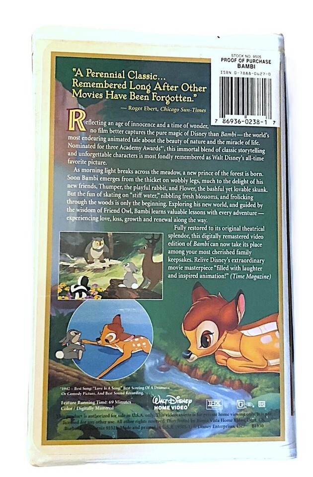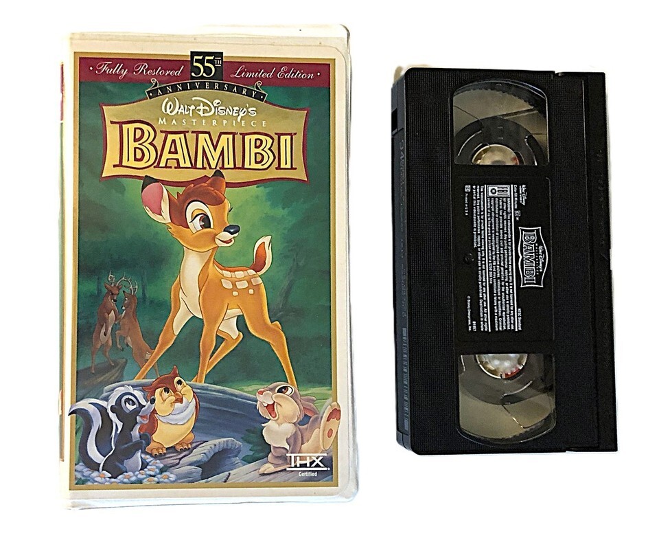 Walt Disney's Bambi Masterpiece 55th Anniversary Limited Edition VHS Tape Clamshell Cover. The tape and cover are in good clean pre-owned condition, the tape has been tested and is in working condition. I do have more VHS tapes and calculated shipping is applied to cart when you purchase multiple items at my shop.