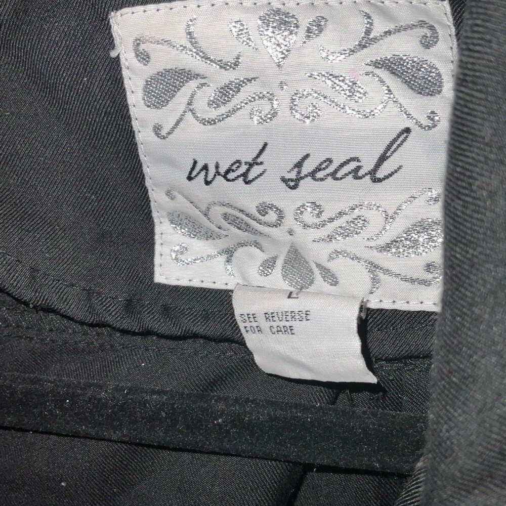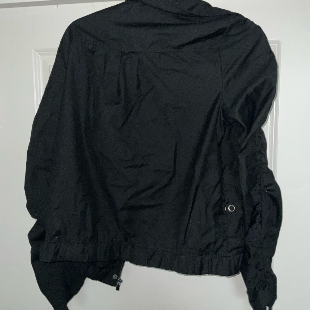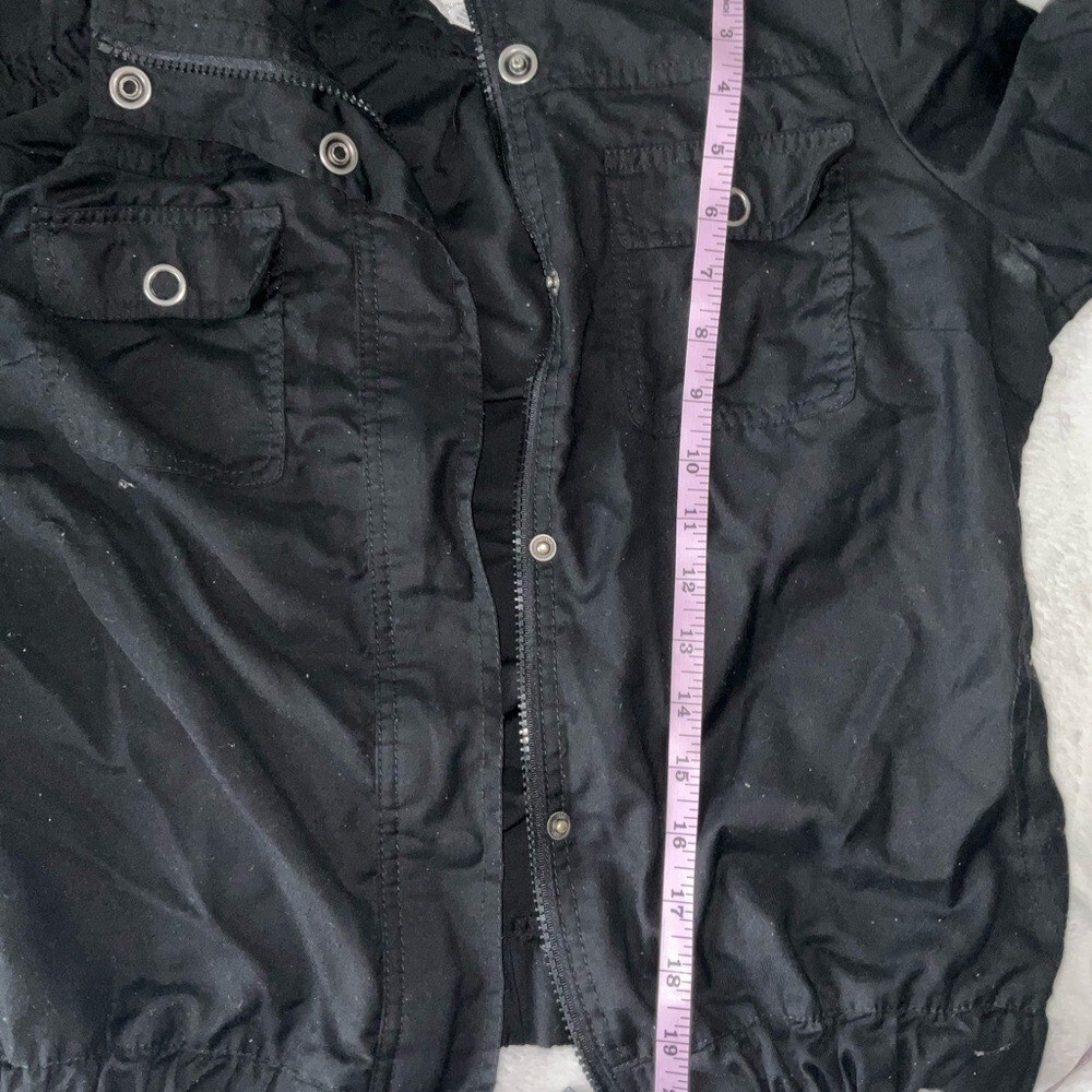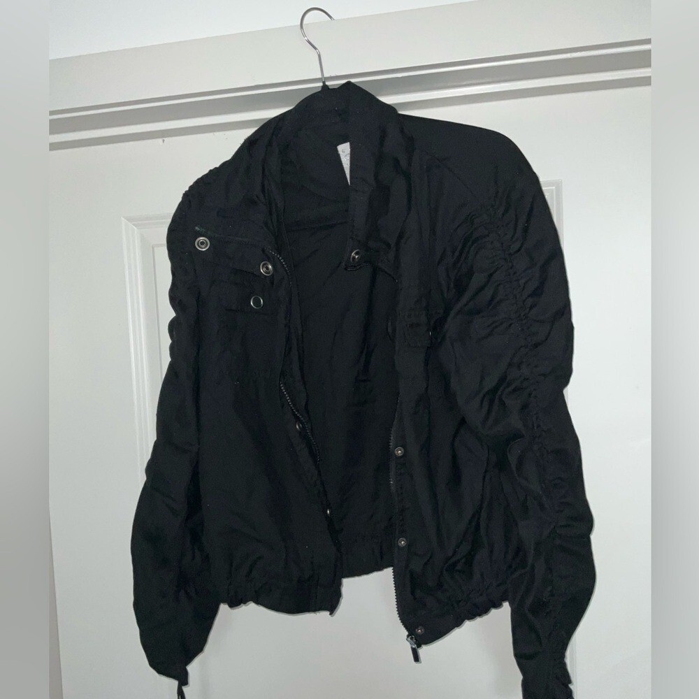 Chic black bomber jacket by Wet Seal. Features a sleek design with ruched sleeves. Ideal for casual outings. Preowned