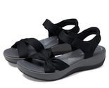 The product is a pair of Clarks Arla Shore black sandals in size 6.5M. These comfortable flat sandals feature a hook and loop closure for easy on and off. The Clarks brand is known for quality and durability, making these athletic sandals a great choice for active women looking for both style and functionality. The black color and classic design make them versatile for various outfits and occasions. Made with a focus on comfort, these sandals are perfect for everyday wear or outdoor activities.