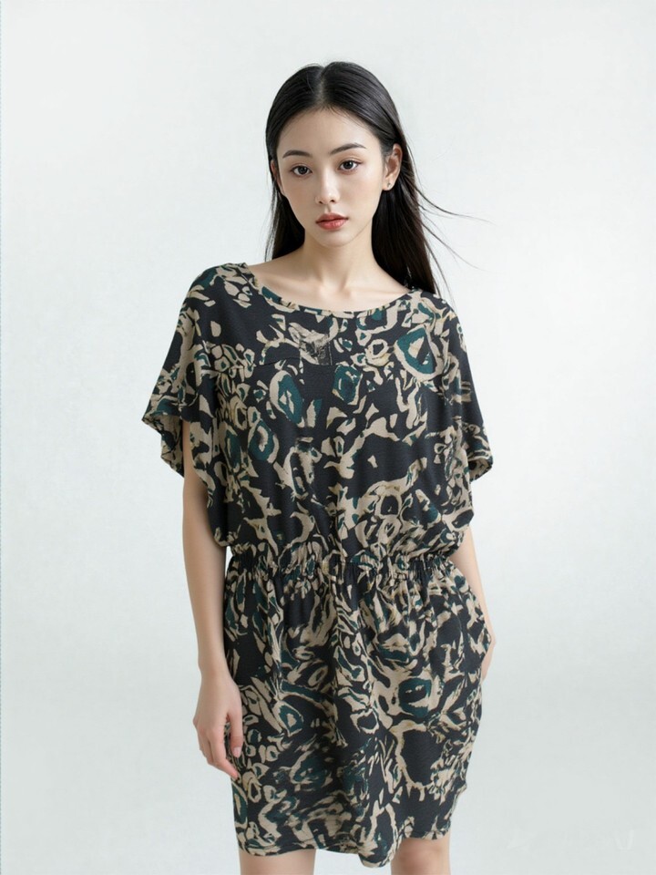 this dress offers a versatile and stylish option for both casual and semi-formal occasions. The short sleeves provide comfort ease of movement, while the carefully designed print adds a modern, artistic touch.
