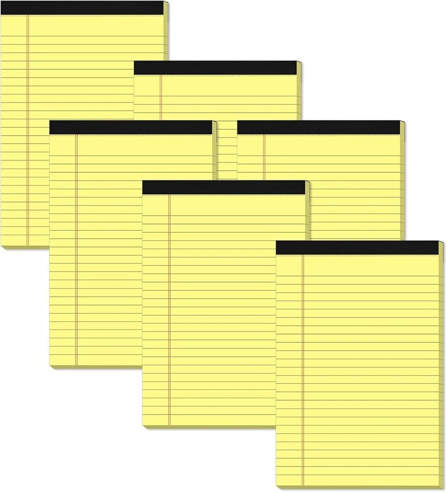 [KEEP NOTES SECURE]: Each yellow writing pads 5x8 has black top bindings. The 5x8 notepad perforated top edge allows for easily and neatly removing individual sheets of paper. Yellow pad 5x8 has sturdy header and bindings keep the pages of your crucial notes protected, yellow lined paper pads won't fall apart under pressure like some lesser notepads. Legal pad features a cardboard backing for extra support when you writing or taking note, legal pad 5x8 perfect for writing on the go.
