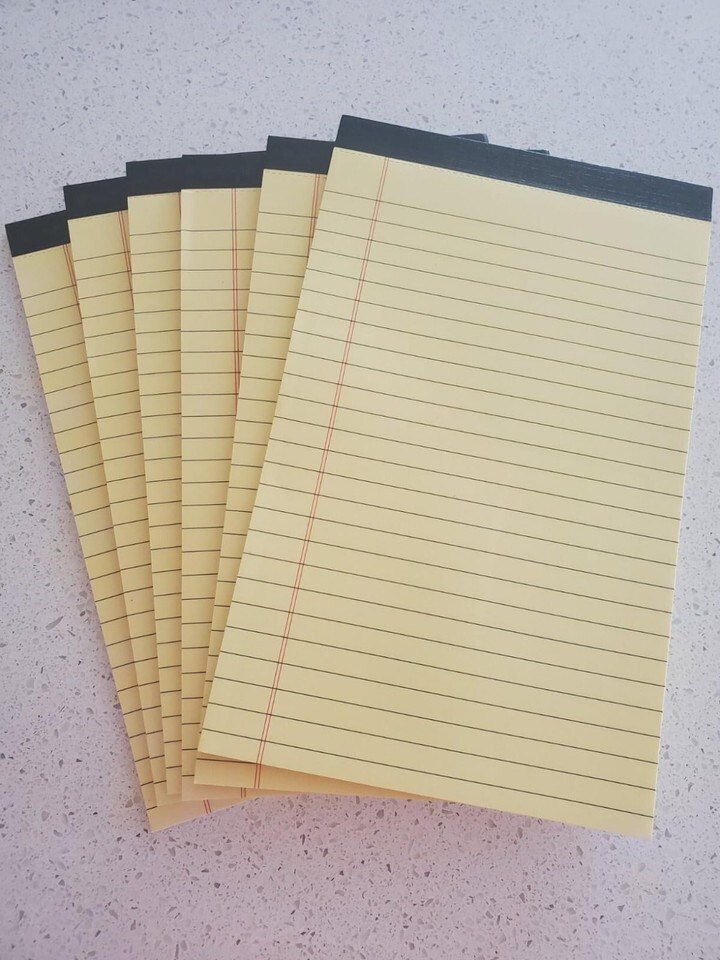 [WIDE RANGE OF APPLICATIONS]: Perforated edge yellow legal notepads for everyday writing is good for students, teachers waitress, home, school or office, business, restaurants and more. You can use yellow notebook pad 5x8 create reminders, to do lists, notes. Take your grocery list with you on the go or stash that to-do in your pocket. There are measures small notebooks writing pads 5x8 in, 6pcs in a pack and 30 sheet per yellow notepad, so you always have one available when it's needed.