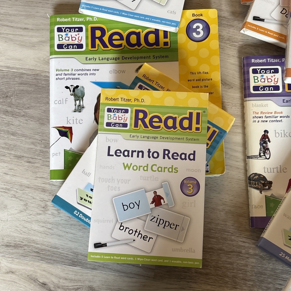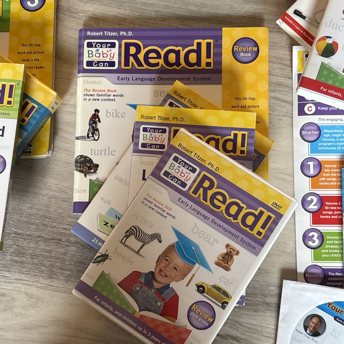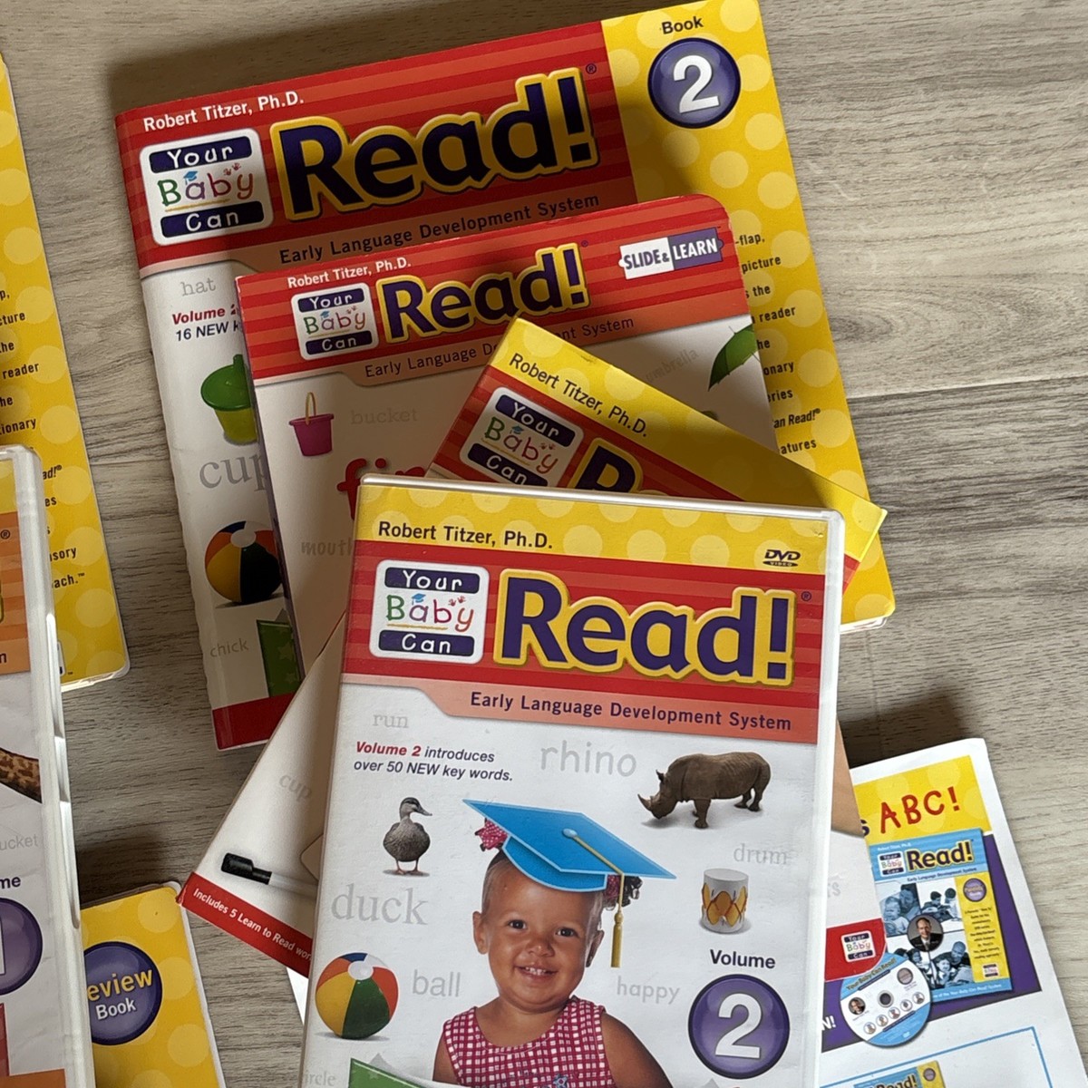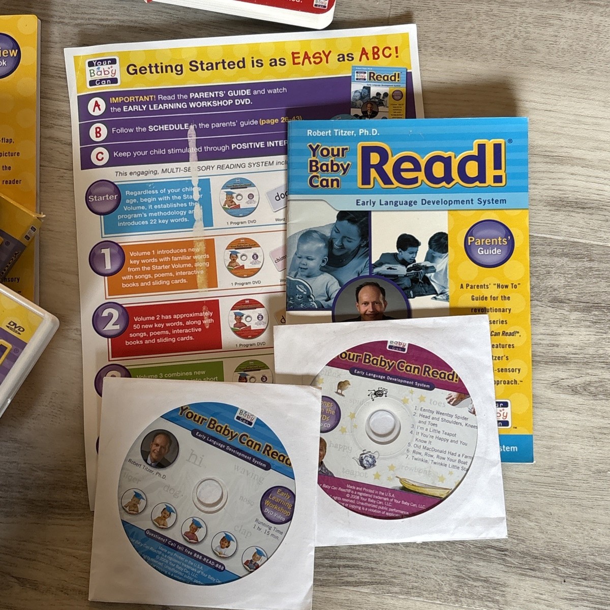 Give your toddler a head start?or at least a fighting chance against Cocomelon?with the Your Baby Can Read! Early Language Development System. This kit includes lift-the-flap books, corresponding DVDs, sliding word cards, parent guides, and a fun CD. It?s the infamous ?As Seen on TV? literacy set developed by Dr. Robert Titzer, perfect for early learners ages 3 months to 5 years. Whether you believe in the science or just want to impress Grandma, this kit has everything but a diploma. Product Info: ? Program: Your Baby Can Read! by Robert Titzer, Ph.D. ? Format: Multi-sensory learning kit ? Includes: ?? 5 Lift-the-Flap Books (Starter and review book plus Volumes 1?3) ?? 3 DVDs (NTSC format) (Review plus Volumes 1 and 2) ?? Slide and Learn 30- Word Card Set ?? Parents? Guide booklet ?? Instructional Early Learning Workshop DVD Video by Dr Titzer (1 Hr 15 min) ?? "Songs from the DVD" Audio CD -- 5 Packets of Learn to Read Word Cards (Review, Starter, Volumes 1-3) -- 82 Double Sided Word Cards Packet --50 Matching Word Game Cards --Getting Started Leaflet ? Condition: missing the "starter program and the vol. 3 DVD's" but includes 2 discs (the intro and the CD) not usually included in the package. DVDs tested and clean. Books and cards show minor handling wear but no damage. Ready to use. Why You?ll Love It: ? hard-to-find set ? Fun, interactive method with sliding cards and visual repetition ? Used by parents, teachers, and overachieving YouTube babies everywhere Smoke free, pet friendly home