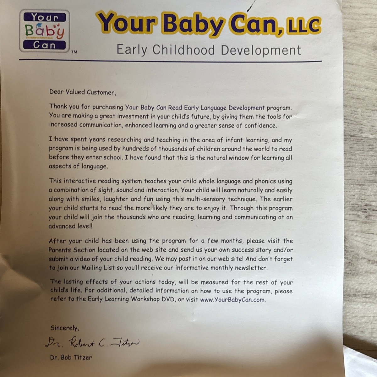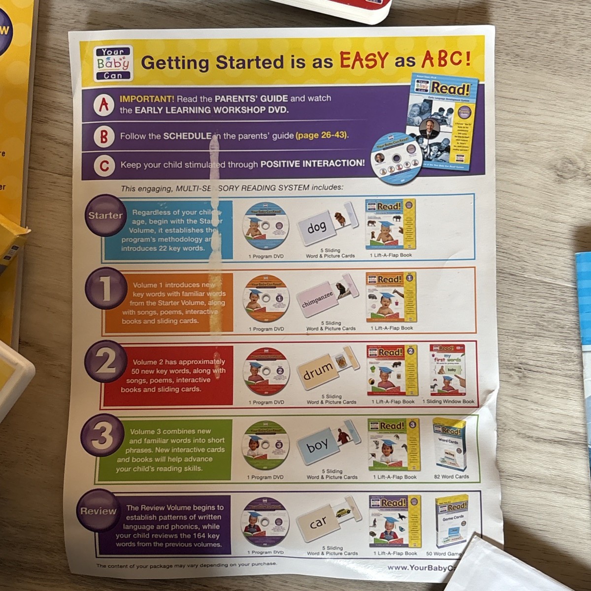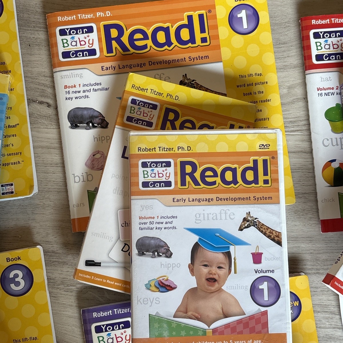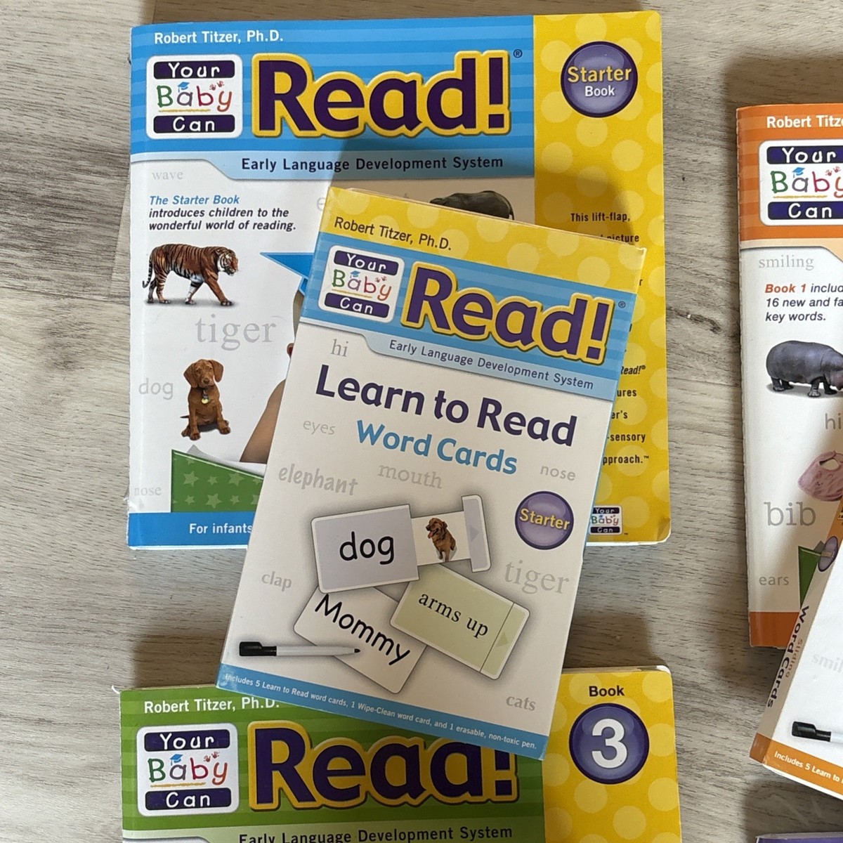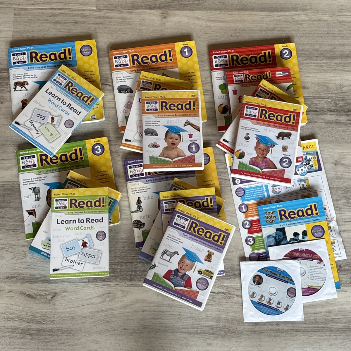 Give your toddler a head start?or at least a fighting chance against Cocomelon?with the Your Baby Can Read! Early Language Development System. This kit includes lift-the-flap books, corresponding DVDs, sliding word cards, parent guides, and a fun CD. It?s the infamous ?As Seen on TV? literacy set developed by Dr. Robert Titzer, perfect for early learners ages 3 months to 5 years. Whether you believe in the science or just want to impress Grandma, this kit has everything but a diploma. Product Info: ? Program: Your Baby Can Read! by Robert Titzer, Ph.D. ? Format: Multi-sensory learning kit ? Includes: ?? 5 Lift-the-Flap Books (Starter and review book plus Volumes 1?3) ?? 3 DVDs (NTSC format) (Review plus Volumes 1 and 2) ?? Slide and Learn 30- Word Card Set ?? Parents? Guide booklet ?? Instructional Early Learning Workshop DVD Video by Dr Titzer (1 Hr 15 min) ?? "Songs from the DVD" Audio CD -- 5 Packets of Learn to Read Word Cards (Review, Starter, Volumes 1-3) -- 82 Double Sided Word Cards Packet --50 Matching Word Game Cards --Getting Started Leaflet ? Condition: missing the "starter program and the vol. 3 DVD's" but includes 2 discs (the intro and the CD) not usually included in the package. DVDs tested and clean. Books and cards show minor handling wear but no damage. Ready to use. Why You?ll Love It: ? hard-to-find set ? Fun, interactive method with sliding cards and visual repetition ? Used by parents, teachers, and overachieving YouTube babies everywhere Smoke free, pet friendly home