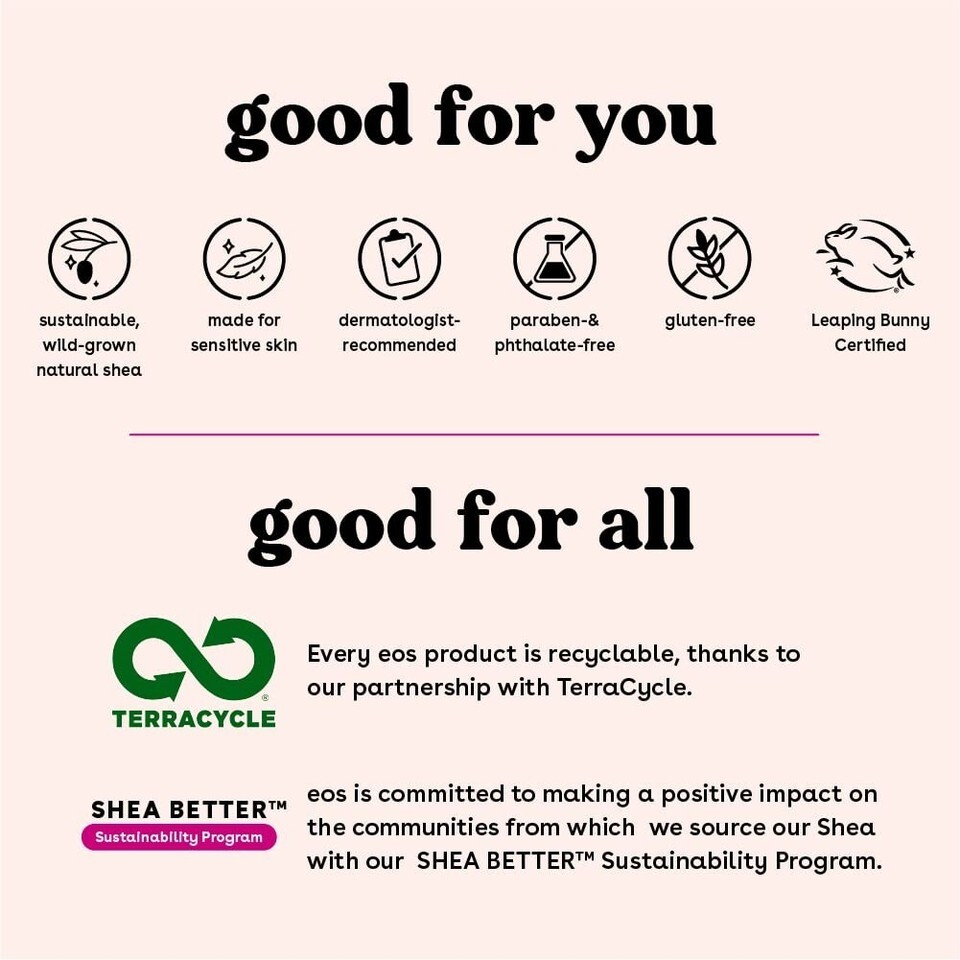 Product Details: 24H MOISTURE SKIN CARE: eos shaving creams provide 24-hour moisture for your legs, underarms, and yes, even intimate areas thanks to our use of Shea Butter with lasting protection, Shea Oil with instant moisture, and soothing aloe that conditions and calms for a silky-smooth shave. SHAVE WET OR DRY: eos shaving cream + in-shower body lotion works their magic both ways! Rinse off or leave on for awesomely smooth skin that also helps prevent nicks and cuts. ALL-NATURAL SHEA BUTTER: eos vegan shave creams have wild grown, sustainably sourced 100% natural shea butter to make your skin feel moisturized, protected, and soft. eos shave cream + lotion is paraben, phthalate and gluten-free. Leaping bunny certified and Cruelty-Free. Ingredients Water/Eau, Cetyl Alcohol, Propylene Glycol, Cocoglycerides, Stearyl Alcohol, Glycerin, Laureth-23, Titanium Dioxide (CI 77891), Colloidal Oatmeal, Petrolatum, Glyceryl Stearate SE, Butyrospermum Parkii (Shea) Oil, Butyrospermum Parkii (Shea) Butter, Helianthus Annuus (Sunflower) Seed Oil, Aloe Barbadensis Leaf Juice, Vanilla Planifolia Fruit Extract, Dimethicone, Caprylyl Glycol, Fragrance/Parfum, Phenoxyethanol, Magnesium Aluminum Silicate, Potassium Sorbate, Carbomer, Hexylene Glycol, Disodium EDTA, Tocopheryl Acetate, Sodium Hydroxide, Citric Acid, Sodium Benzoate, Ascorbyl Palmitate, Limonene, Linalool, Coumarin.