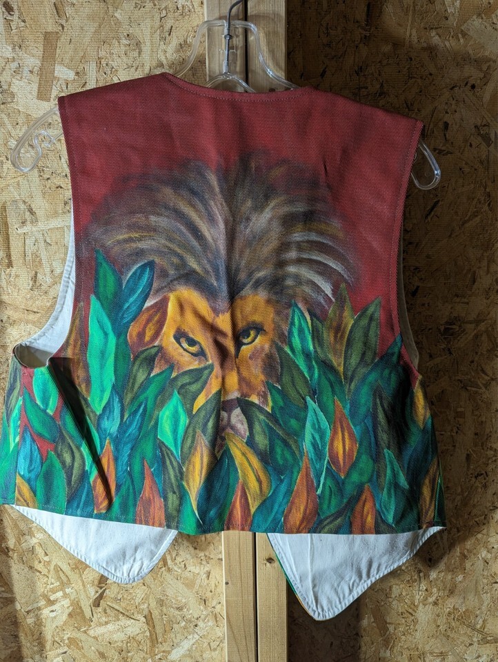 Add a touch of the jungle to your wardrobe with this unique hand-painted vest by The Mommas of Longview Texas. The sleeveless, collarless vest is made of faux leather with a multicolor jungle pattern that is sure to make a statement. The vest features a fishtail hem and is lined with 100% cotton for comfort. This limited edition vest is a size medium and should be dry cleaned only. It is perfect for any season, whether you want to wear it in the winter for an added layer of warmth or in the summer as a statement piece. This vest is not vintage and has not been personalized. 42" chest and 23" length